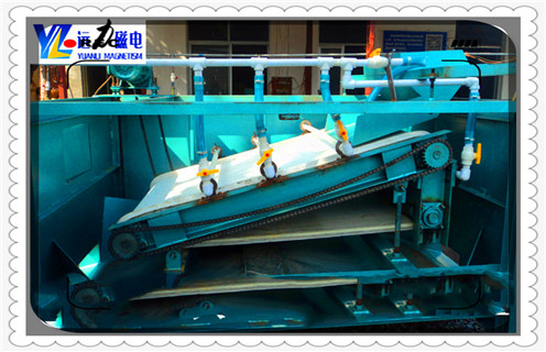 平板式有色金屬磁選機(jī)_平板式有色金屬磁選機(jī)分選運(yùn)行視頻,平板磁選機(jī)采用的帶式分選結(jié)構(gòu),在整個的工作區(qū)域從進(jìn)料到出料,物料在皮帶的的帶動下,可對物料進(jìn)行多次的磁攪拌,同時在水流的的沖洗作用下,把不含磁的的尾礦除去,帶有磁性的的礦物被皮帶輸送到板選機(jī)的的脫磁區(qū),從而將帶有磁性的的礦物通過脫磁裝置脫掉,來完成選礦的的過程,整機(jī)功率小、處理大,磁場強(qiáng)度高,并達(dá)到很好的的品質(zhì),能夠獲得更大的的效益。